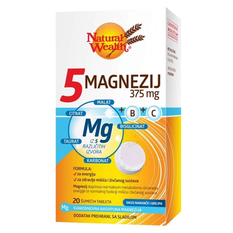 - Naziv proizvoda: NATURAL WEALTH 5 Magnezij 375 mg + B + C, 20 šumećih tableta