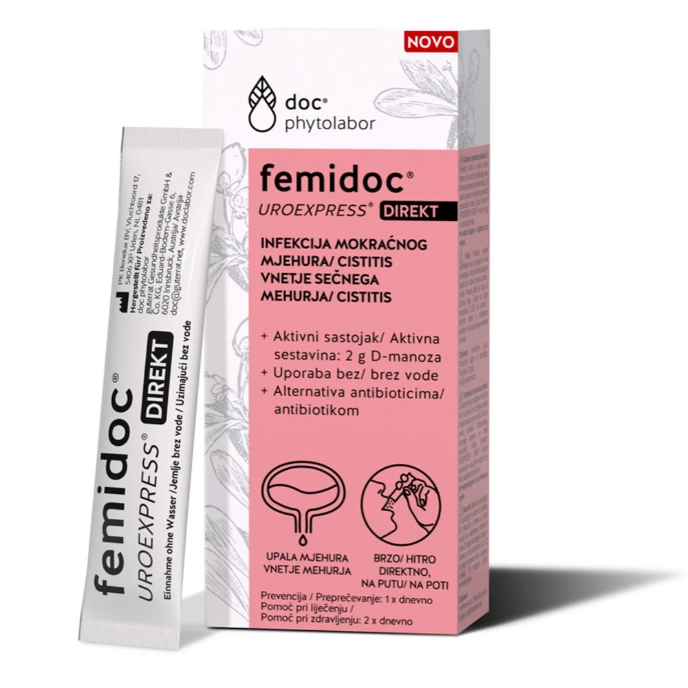 femidoc URO EXPRESS DIREKT upotrebljava se kao pomoć pri liječenju infekcije mokraćnih kanala u mjehuru izazivane bakterijom E. coli, ali i kao zaštita od ponovnih upala mokraćnih kanala (upale mjehura). Uz to je ugodnog je okusa i blag za prirodnu floru crijeva, mokraćnog mjehura i vagine.