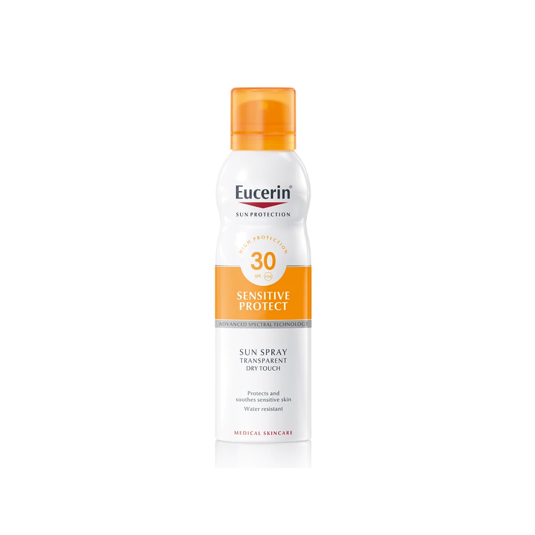 Eucerin Sensitive Protect Dry Touch SPF 30 sprej za tijelo s visokim zaštitnim faktorom za osjetljivu kožu je i dermatološki prikladan za osjetljivu kožu uključujući i kožu s aknama.