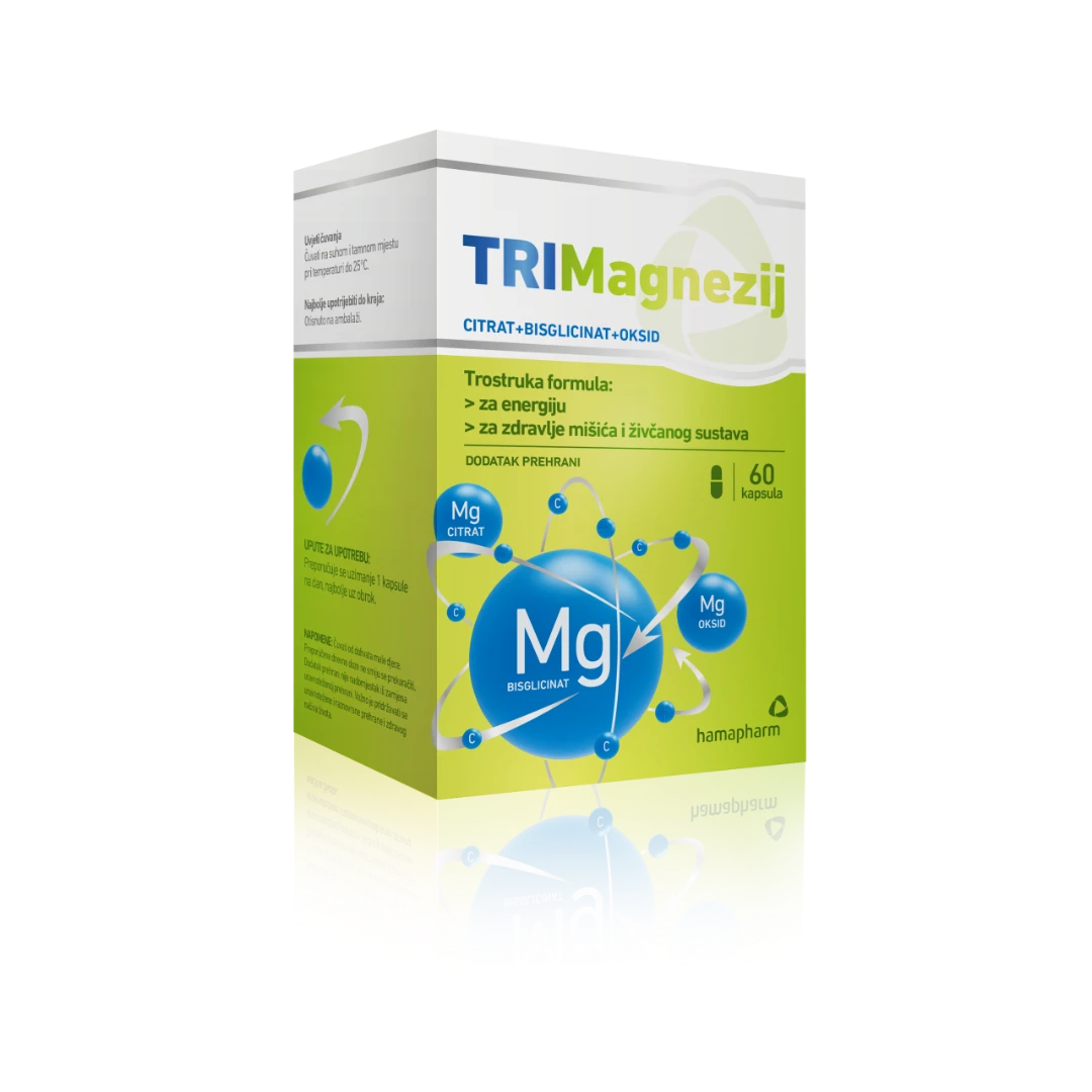 TriMagnezij sadrži 375mg magnezija. Trostruka je kombinacija magnezij bisglicinata, citrata i oksida za 5 puta veću iskoristivost, bržu apsorpciju i bolju bioraspoloživost u organizmu.